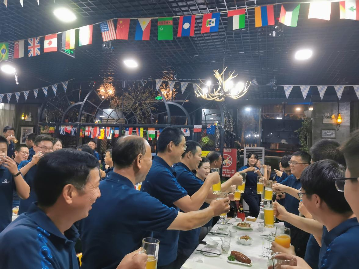 19:38分正式进入团餐晚宴环节,恒盛娱乐大家长总经理陈总带头,其他核心管理层先后逐一发出了祝酒词,晚宴上全体家人推杯换盏,热闹非凡。